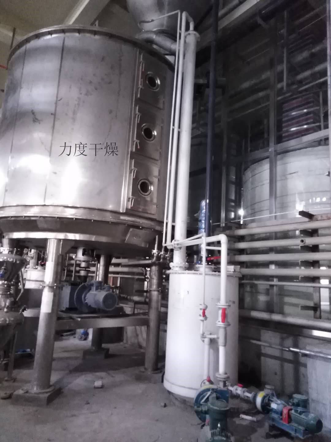 在動(dòng)態(tài)情況下處理:原料經(jīng)輸送泵送至干燥主機(jī)干燥主體內(nèi),同時(shí)加熱介質(zhì)通過(guò)管道泵輸送至干燥機(jī)的加熱夾層內(nèi),原料通過(guò)干燥機(jī)器壁獲取熱量而被加熱,在真空系統(tǒng)的作用下逐漸被帶走水分而達(dá)到干燥目的;在原料接近干燥階段,為防止部分粉末被真空泵抽出,設(shè)計(jì)采用特制袋濾器收集;原料所含的有機(jī)溶劑通過(guò)特殊冷凝器二級(jí)冷凝,使整體回收率達(dá)95%以上。