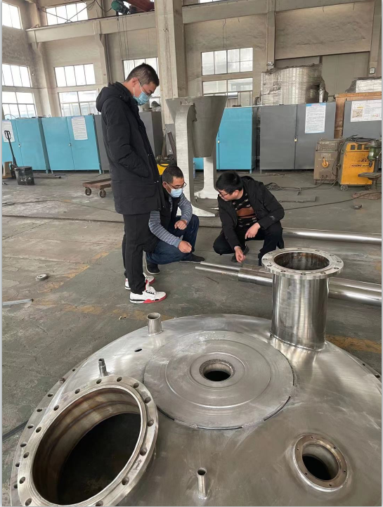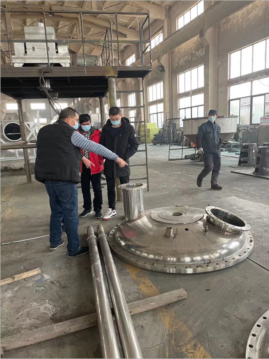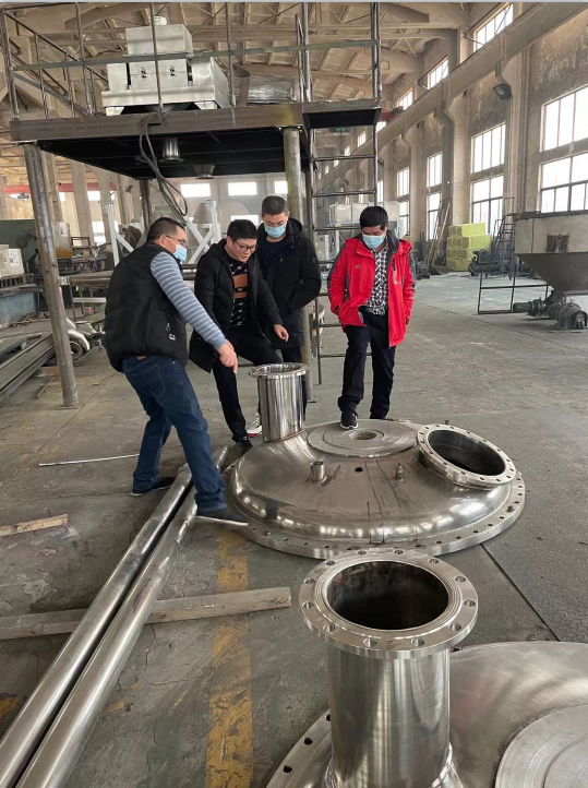 近日我司老客戶浙江某上市公司一行人,在查總的陪同下參觀了生產車間,針對性的了解了我司zhuanli產品單錐螺帶真空干燥機及細節處理。