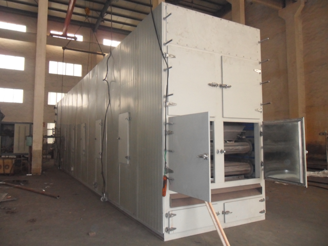 帶式干燥機是一種連續(xù)式干燥設(shè)備,由若干個獨立的單元段組成。每個單元段均包括循環(huán)風(fēng)機、加熱裝置、單獨或公用的新鮮空氣抽入系統(tǒng)和尾氣排出系統(tǒng)。它通過將物料均勻鋪在網(wǎng)狀輸送帶上,在傳動裝置的驅(qū)動下,物料在干燥機內(nèi)勻速移動,并與穿過多層輸送帶的熱空氣進行充分的熱交換,從而實現(xiàn)高效、均勻的干燥目的。