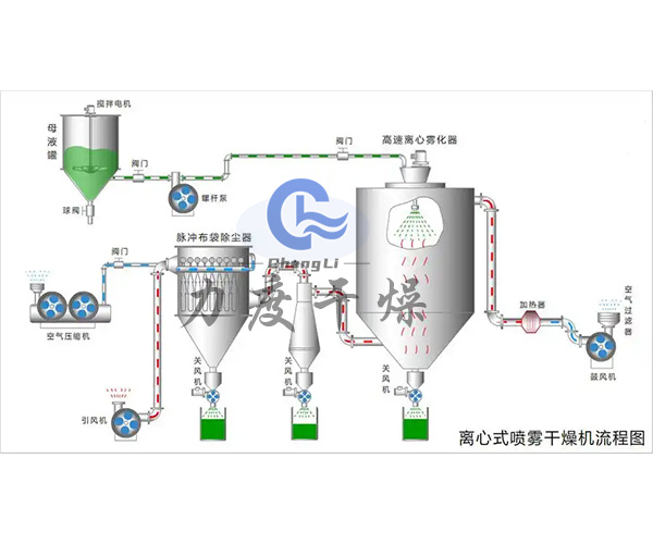 在干燥塔頂部導入熱風,同時將料液送至塔頂部,通過霧化器噴成霧狀液滴,這些液滴群的表面積很大,與高溫熱風接觸后水分迅速蒸發,在極短的時間內便成為干燥產品,從干燥塔底排出熱風與液滴接觸后溫度顯著降低,濕度增大,它作為廢氣由排風機抽出,廢氣中夾帶的微粒用分離裝置回收。