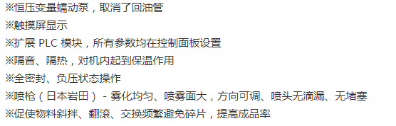 高效包衣機主要由主機、熱風機、排風機、噴霧系統、微處理機可編程序控制系統組成。