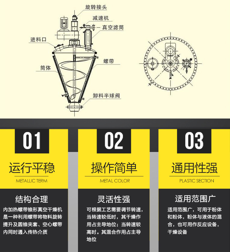 錐形螺帶真空干燥機(jī)裝填率為有效工作容積的30%—90%,在此范圍內(nèi)不同裝料量的混合和干燥都可以得到一致的結(jié)果。