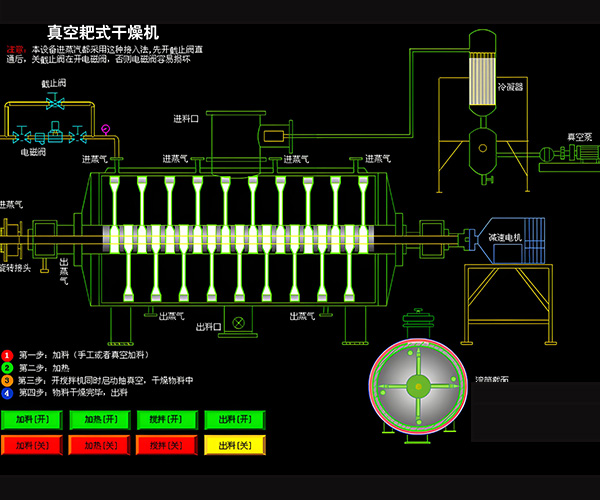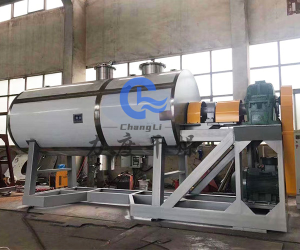 環(huán)氧樹(shù)脂從殼體上方投料口加入,在不斷轉(zhuǎn)動(dòng)的耙齒的攪拌下,物料與殼體壁接觸時(shí),表面不斷更新,被干燥物料受到蒸汽(或熱水、導(dǎo)熱油)間壁加熱,而使物料內(nèi)濕份汽化,汽化的濕份由真空泵及時(shí)抽走。
