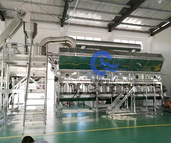 1. 干燥主機——結構形式:臥式多室流化床結構,帶冷卻段;材質:與物料接觸部分為SUS304不銹鋼,其余為碳鋼;床層結構:多孔板+風室,確保氣流分布均勻;干燥溫度:進風溫度120~160℃,出風溫度60~80℃;操作方式:連續進料、連續出料;密封結構:采用機械密封+氮氣保護(可選),防止粉塵外泄;清洗系統:配置CIP在線清洗系統,便于定期清洗,符合GMP標準;出料方式:底部螺旋出料或溢流口出料,確保出料順暢。