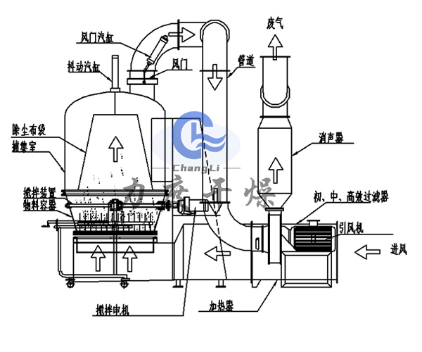 待干燥的物料(顆粒或細粉)投入干燥器料斗,空氣經初效過濾器除塵后,由加熱器升溫至干燥所需要的溫度,然后進入主塔,當其穿過料斗底部的席型分布板,使料斗內物料流化同時除去水份而干燥,水份揮發后隨排風經布袋過濾器過濾后由風機排出,干燥過程中隨風上升的細粉則由布袋捕集,并通過清灰裝置返回流化床。